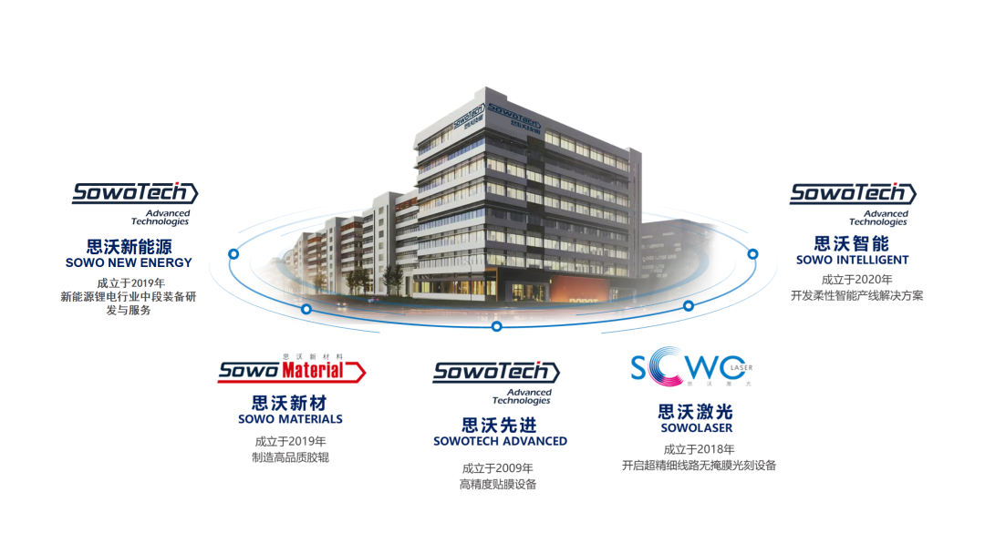 集團(tuán)旗下?lián)碛懈呔荣N膜設(shè)備思沃先進(jìn)裝備,開(kāi)發(fā)柔性智能產(chǎn)線解決方案的思沃智能,開(kāi)啟超精細(xì)線路無(wú)掩膜光刻設(shè)備的思沃激光,新能源鋰電設(shè)備思沃新能源,制造高品質(zhì)膠輥的思沃新材。