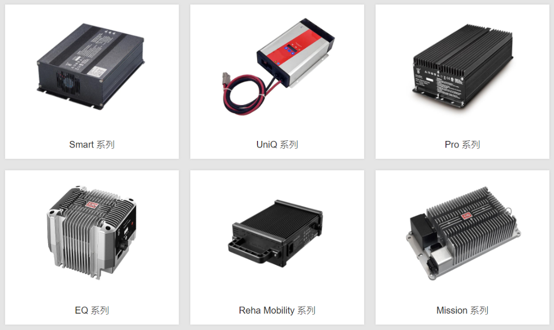 除此之外的主要標(biāo)準(zhǔn)品充電器有7大系列:Smart系列、UniQ系列、Pro系列、 EQ系列、Reha系列、Mission系列和N系列,全面覆蓋工程機(jī)械、高空作業(yè)平臺(tái),環(huán)衛(wèi)清潔車、洗地機(jī)、掃地機(jī)、AGV、機(jī)器人、輪椅、代步車、觀光車、物流叉車、園藝護(hù)理設(shè)備、農(nóng)用機(jī)械、機(jī)場(chǎng)地勤設(shè)備等領(lǐng)域以電池為動(dòng)力的設(shè)備和低速車的充電。