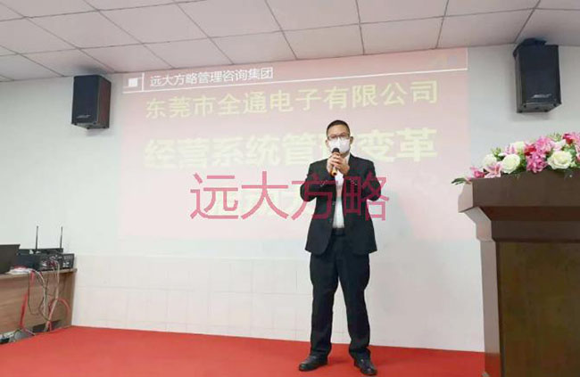 項(xiàng)目啟動(dòng)會(huì)上,東莞市全通電子總經(jīng)理唐忠華先生致辭表示:“ 公司進(jìn)行經(jīng)營(yíng)系統(tǒng)管理變革的意義,對(duì)于全通公司,不是要不要“變”,而是怎樣“變”、什么時(shí)候“變”的問題。遠(yuǎn)大方略管理咨詢集團(tuán)已輔導(dǎo)過上千家 制造型公司,我們周邊有非常多的案例,我們“看見”所以“相信”。本次的合作,我們要借力遠(yuǎn)大方略,以減少全通公司在成長(zhǎng)過程中摸索和出錯(cuò)的幾率,用較短的時(shí)間走完較長(zhǎng)的發(fā)展之路,實(shí)現(xiàn)快速騰飛。“主動(dòng)是人才,被動(dòng)是奴才”,所有管理者在項(xiàng)目合作期間,必須積極參與到這場(chǎng)“戰(zhàn)役”中,并與遠(yuǎn)大方略老師互動(dòng)、配合,形成推動(dòng)管理改善的合力。最后,預(yù)祝本次全通公司進(jìn)行的經(jīng)營(yíng)系統(tǒng)管理變革活動(dòng)能夠取得圓滿成功,希望我們的管理團(tuán)隊(duì)能在這次洗禮中實(shí)現(xiàn)自我成長(zhǎng)。”