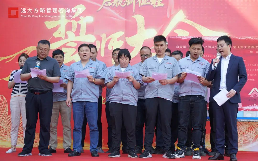 任正非說,產(chǎn)品發(fā)展的路標(biāo)是客戶需求導(dǎo)向,企業(yè)管理的目標(biāo)是流程型組織建設(shè)。此次變革就是增強(qiáng)組織能力,提高企業(yè)的管理水平和競爭力,支撐公司戰(zhàn)略目標(biāo)的實(shí)現(xiàn)。針對變革,老師有方法和工具,但是需要大家一起攜手將方案有效落地,推動(dòng)此次變革的順利進(jìn)行。會(huì)上遠(yuǎn)大方略項(xiàng)目組老師也上臺進(jìn)行了宣誓,必將全力以赴做好此次海天重工的項(xiàng)目改善,助力企業(yè)更成功。