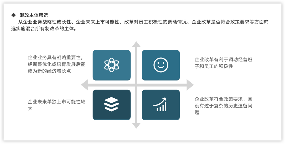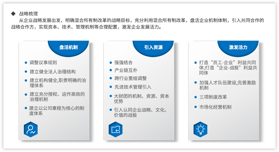 黨的十九大報告指出:“要深化國有企業(yè)改革,發(fā)展混合所有制經(jīng)濟,培育具有全球競爭力的世界一流企業(yè)”;當前,隨著國企改革“雙百行動”、區(qū)域性國資國企綜合改革試驗、“科改示范行動”、第三批以及第四批混改試點的實施,國企改革由點向面梯次鋪開、范圍逐步擴大,并呈現(xiàn)明顯加速,國有企業(yè)改革進入“深水區(qū)”。追本溯源,國企改革到底怎么改,回到國有企業(yè)改革的初衷我們認為,國有企業(yè)改革是以混和所有制為手段,在堅持黨的領導下建立現(xiàn)代企業(yè)制度,優(yōu)化管理關系,創(chuàng)新管理機制,激發(fā)員工活力,從而最終實現(xiàn)國有企業(yè)的持續(xù)發(fā)展?;旄穆鋵嵉骄唧w實踐中,便處處是難點。遠大方略認為,混改的重點已經(jīng)從以“政策研究+方案制定”為主轉(zhuǎn)變到以化解落地過程中的實際痛點為主,從剖析“為什么混、和誰混、怎么混”轉(zhuǎn)變?yōu)槁鋵嵵卫斫Y構、戰(zhàn)略協(xié)同以及激勵機制等深層次問題。
