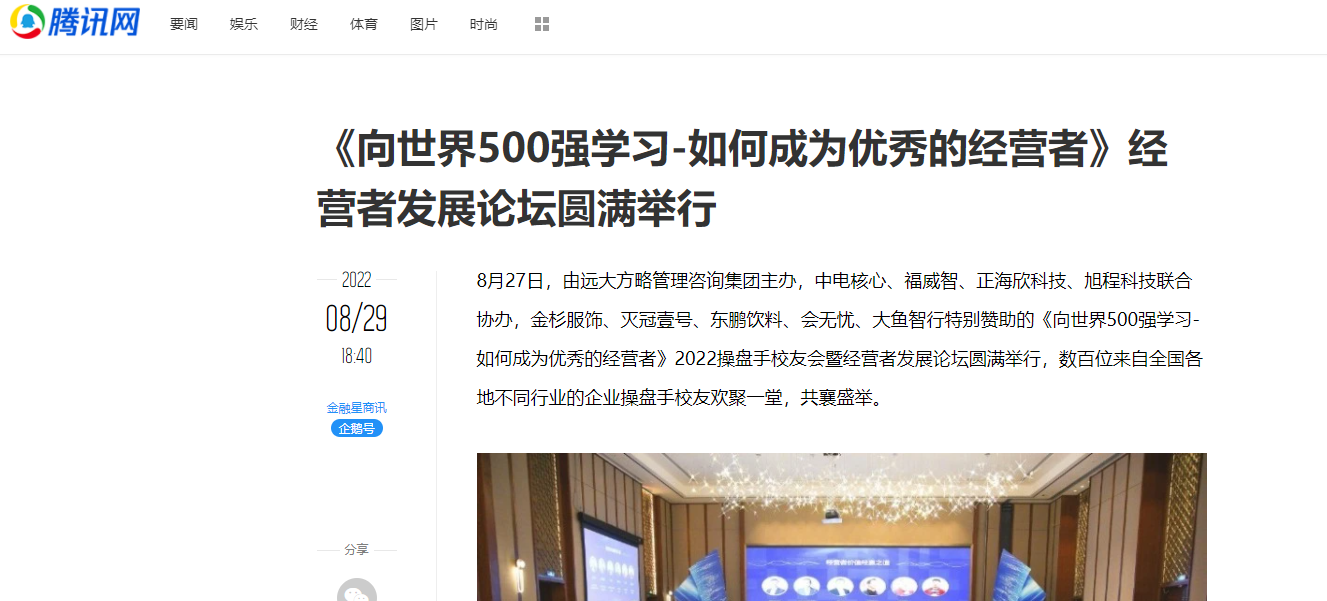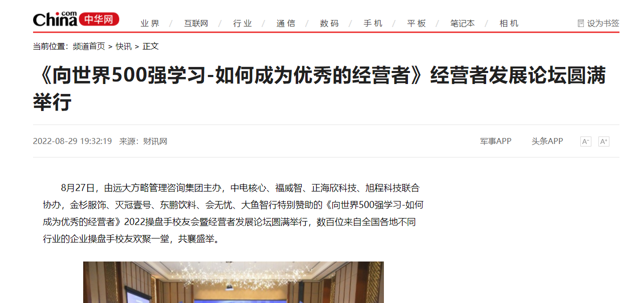 8月27日,由遠大方略管理咨詢集團主辦,中電核心、福威智、正海欣科技、旭程科技聯(lián)合協(xié)辦,金杉服飾、滅冠壹號、東鵬飲料、會無憂、大魚智行特別贊助的《向世界500強學習-如何成為優(yōu)秀的經營者》2022操盤手校友會暨經營者發(fā)展論壇圓滿舉行,數(shù)百位來自全國各地不同行業(yè)的企業(yè)操盤手校友歡聚一堂,共襄盛舉。
