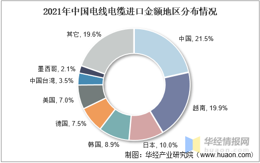 從進(jìn)口分布情況來(lái)看,2021年我國(guó)電線電纜進(jìn)口金額中,占比前三的地區(qū)分別為中國(guó)、越南和日本,占比分別為21.5%、19.9%和10%。