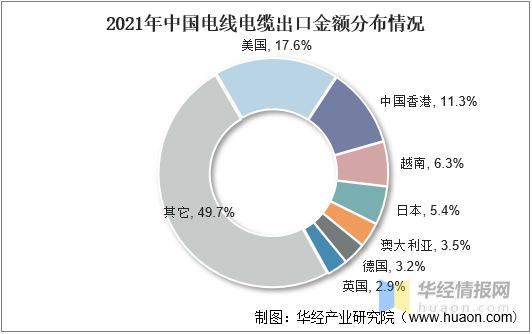 從出口分布情況來(lái)看,2021年我國(guó)電線電纜出口金額中,占比前三的地區(qū)分別為美國(guó)、中國(guó)香港及越南,占比分別為17.6%、11.3%和6.3%。