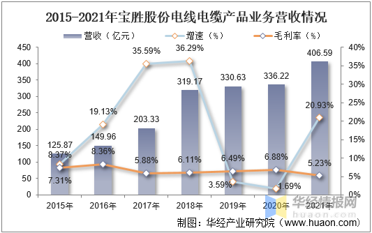 寶勝科技創(chuàng)新股份有限公司(簡(jiǎn)稱寶勝股份)是中國(guó)航空工業(yè)集團(tuán)公司旗下的上市公司,公司主要從事電線電纜及電纜附件開發(fā)、制造、銷售及相關(guān)的生產(chǎn)技術(shù)開發(fā)。公司產(chǎn)品覆蓋裸導(dǎo)體、電氣裝備用電纜、電力電纜、通信電纜及光纜等,是我國(guó)電線電纜行業(yè)主要龍頭企業(yè)之一。據(jù)資料顯示,2021年寶勝股份電線電纜產(chǎn)品業(yè)務(wù)營(yíng)收為406.59億元,同比增長(zhǎng)20.93%,毛利率為5.23%。