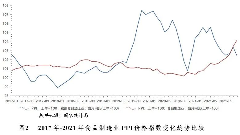 由于成本端原材料、包材、運(yùn)費(fèi)齊漲,產(chǎn)業(yè)鏈利潤(rùn)被擠壓,2021年食品制造業(yè)出廠價(jià)格呈現(xiàn)上漲趨勢(shì)。國(guó)家統(tǒng)計(jì)局?jǐn)?shù)據(jù)顯示,2021年食品制造業(yè)工業(yè)生產(chǎn)者出廠價(jià)格指數(shù)為104.20,農(nóng)副食品制造業(yè)工業(yè)生產(chǎn)者出廠價(jià)格指數(shù)為102.4,表明食品價(jià)格較2020年同期略有增長(zhǎng)。在“疫情”之下,食品作為剛需產(chǎn)品,需求下降不明顯,價(jià)格并未受到較大影響。