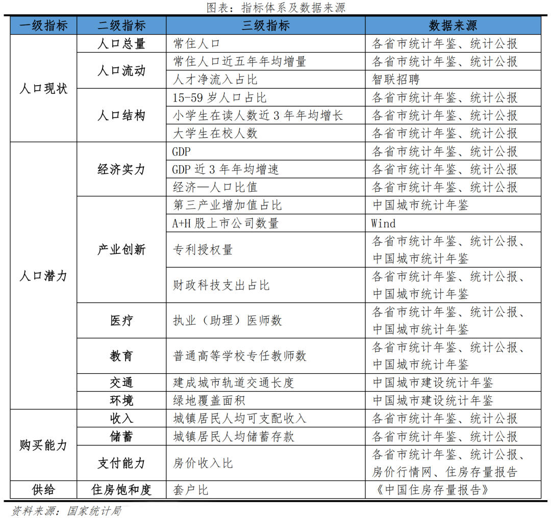 在數(shù)據(jù)選擇上,我們從“需求+供給”兩個層面建立基本面分析框架。需求側關注人口現(xiàn)狀、人口潛力以及人口購買能力,供給側關注區(qū)域住房存量情況,共涉及21個指標。