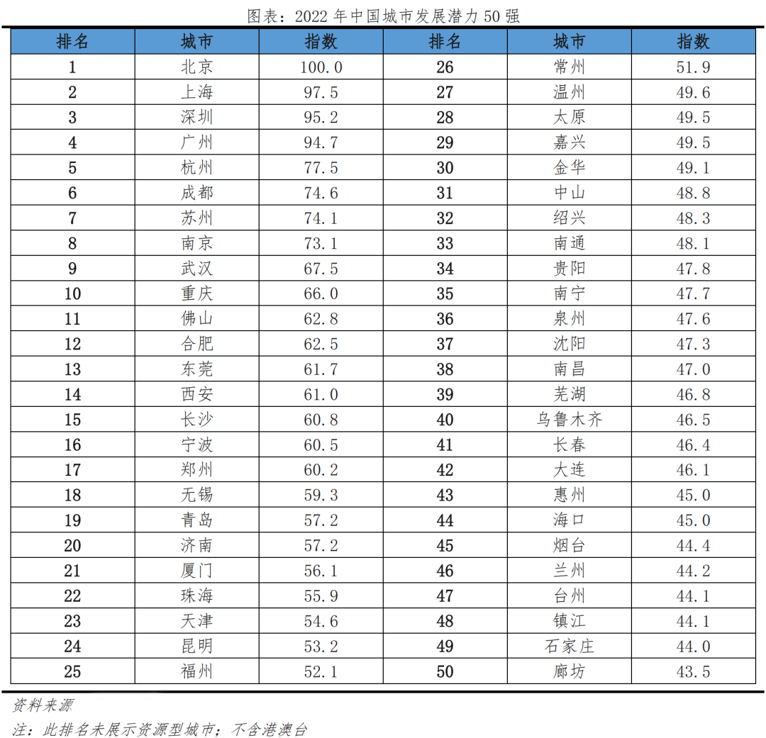 2022年城市發(fā)展?jié)摿ε琶?,北京占?jù)榜首,上海、深圳、廣州以較小分差緊隨其后。第5-10名分別為杭州、成都、蘇州、南京、武漢、重慶。合肥、西安、長沙等省會城市,寧波、青島等計劃單列市,佛山、東莞、無錫等發(fā)達地級市進入前20名。