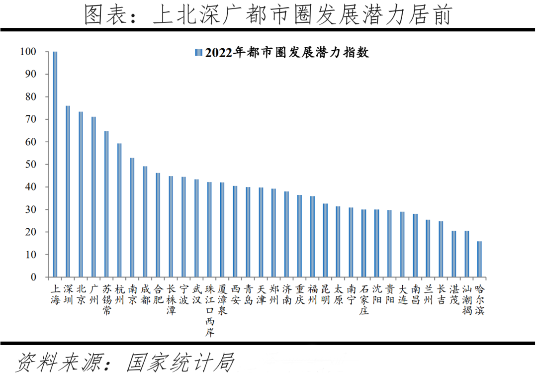 在都市圈層面,34個千萬級都市圈以18.6%的土地集聚63%的人口創(chuàng)造約78%的GDP,其中上海、深圳、北京、廣州等都市圈發(fā)展?jié)摿忧啊?/p>