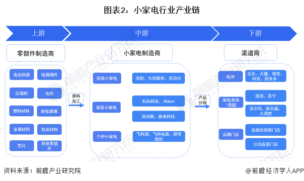 小家電產(chǎn)業(yè)鏈主要分為上游原材料和零部件供應(yīng)、中游小家電制造和下游小家電銷售三大環(huán)節(jié)。小家電行業(yè)上游原材料和零部件包括電加熱器、電器閥件、塑料、金屬材料、包裝材料等各類零部件供應(yīng)商,由于各種不同小家電所需原材料零部件不同,因此上游覆蓋企業(yè)范圍較廣,品牌也較多元化;中游小家電制造企業(yè)包含了國外大企業(yè)(如飛利浦)和國內(nèi)家電綜合制造企業(yè)(如美的)、小家電制造企業(yè)各類型企業(yè);下游主流銷售渠道有綜合電商平臺(如天貓商城、京東商城等)、線下家電賣場(如蘇寧、國美)、大型商超、各級經(jīng)銷商門店、公司直營門店等各類分銷渠道。