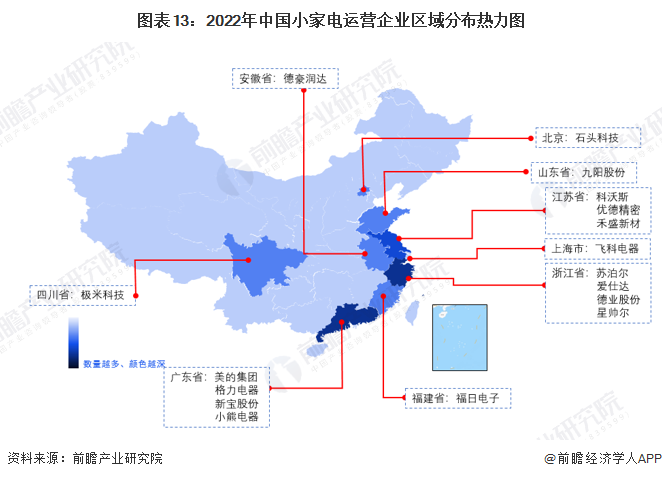 截至2022年6月中旬,根據(jù)中國企業(yè)數(shù)據(jù)庫企查貓,目前中國小家電行業(yè)的主要企業(yè)共有4348家,從企業(yè)主體注冊地分布來看,中國小家電企業(yè)主要分布在珠三角及華東區(qū)域,特別以廣東和浙江為代表,目前廣東共有相關(guān)小家電企業(yè)數(shù)2113家,浙江則有1654家。而從小家電產(chǎn)業(yè)鏈相關(guān)上市企業(yè)分布情況來看,兩地也是聚集了眾多的企業(yè),如廣東的美的集團、格力電器、新寶股份、小熊電器,浙江的蘇泊爾、愛仕達、德業(yè)股份等。