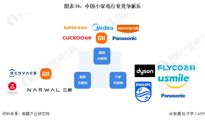 根據(jù)各市場主體主營產(chǎn)品的類型差異,中國小家電行業(yè)可以劃分為三個競爭派系。廚房小家電領(lǐng)域的主要參與者有美的集團、蘇泊爾、九陽股份、松下電器等;家居小家電產(chǎn)品主要包括掃地機器人、洗地機、無線吸塵器等產(chǎn)品,參與者包括科沃斯、石頭科技、小米科技、云鯨等品牌;個護小家電產(chǎn)品主要包括電吹風(fēng)、電動剃須刀、電動牙刷等產(chǎn)品,市場參與者包括戴森、飛利浦、飛科電器、松下電器、USMILE等。
