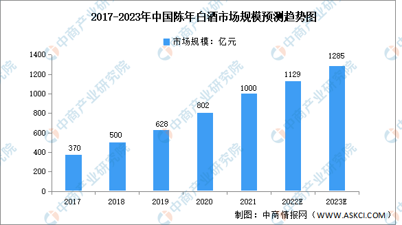 陳年白酒是由具備白酒生產(chǎn)資質(zhì)企業(yè)以傳統(tǒng)白酒工藝釀造,出廠10年以上,且保存完好的白酒產(chǎn)品。近年來,茅臺酒、五糧液、汾酒、瀘州老窖特曲等品牌的陳年酒市場規(guī)模高速增長,由2017年的370億元增長至2021年的1000億元,復(fù)合年均增長率達28.2%。未來,隨著國民消費水平進一步提高,預(yù)計2023年我國陳年白酒市場規(guī)模將達1285億元。