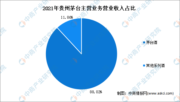 從主營產(chǎn)品來看,2021年貴州茅臺主營產(chǎn)品茅臺酒營業(yè)收入為934.65億元,占比88.02%。