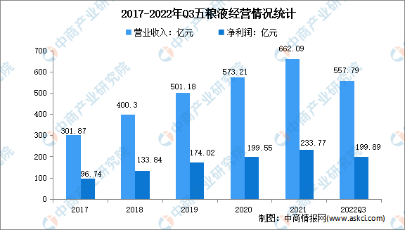 五糧液主要產(chǎn)品“五糧液酒”是我國濃香型白酒的典型代表。同時,五糧液根據(jù)生產(chǎn)工藝特點開發(fā)了五糧春、五糧醇、五糧特曲、尖莊等品類齊全、層次清晰的系列酒產(chǎn)品。2021年,五糧液營業(yè)收入達662.09億元,凈利潤實現(xiàn)233.77億元。2022年前三季度實現(xiàn)營業(yè)收入557.79億元,凈利潤199.89億元。