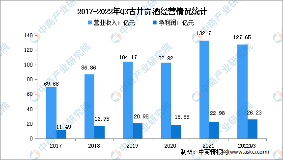 古井貢酒是中國老八大名酒企業(yè),是中國第一家同時發(fā)行A、B兩支股票的白酒類上市公司,坐落在世界十大烈酒產(chǎn)區(qū)之一的安徽省亳州市。2021年,古井貢酒營業(yè)收入達132.7億元,實現(xiàn)凈利潤22.98億元。2022年前三季度實現(xiàn)營業(yè)收入127.65億元,凈利潤26.23億元。