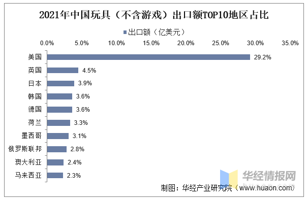 從出口目的地看,美國是第一大出口國,2021年我國玩具(不含游戲)出口到美國的金額占比達(dá)到2.92%,其次是英國、日本、韓國、德國、荷蘭、墨西哥、俄羅斯聯(lián)邦、澳大利亞、馬來西亞等地。