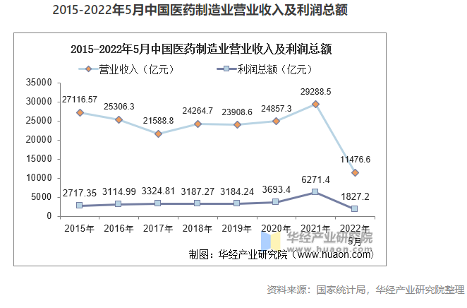 2016年,醫(yī)藥制造業(yè)由于受到一系列政策調控和企業(yè)轉型的影響,藥品價格受到嚴格監(jiān)管和控制,行業(yè)整體營業(yè)收入出現(xiàn)下滑,隨后市場競爭環(huán)境改善,營業(yè)收入逐漸恢復增長趨勢,2021年中國醫(yī)藥制造業(yè)的營業(yè)收入為29288.5億元,利潤總額為6271.4億元,利潤率為21.4%,截至2022年5月,我國醫(yī)藥制造業(yè)2022年利潤率為15.9%。