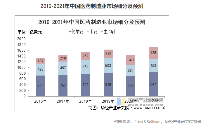 醫(yī)藥制造業(yè)三大種類中,化學藥的市場占比最多,化學藥主要用于人體疾病防治、診斷。應用領域較為廣泛和普及,2020年我國化學藥市場規(guī)模大709億美元,占比49.2%;生物藥憑借其藥理活性高、特異性強、治療效果好等特點,越來越受市場關注,其市場規(guī)模由2016年的184億美元增長至2020年的349億美元。慢性病的治療周期較長,我國中藥在慢性病的治療中具有不可替代的作用,2021年我國中藥制造企業(yè)規(guī)模預計為458億美元。