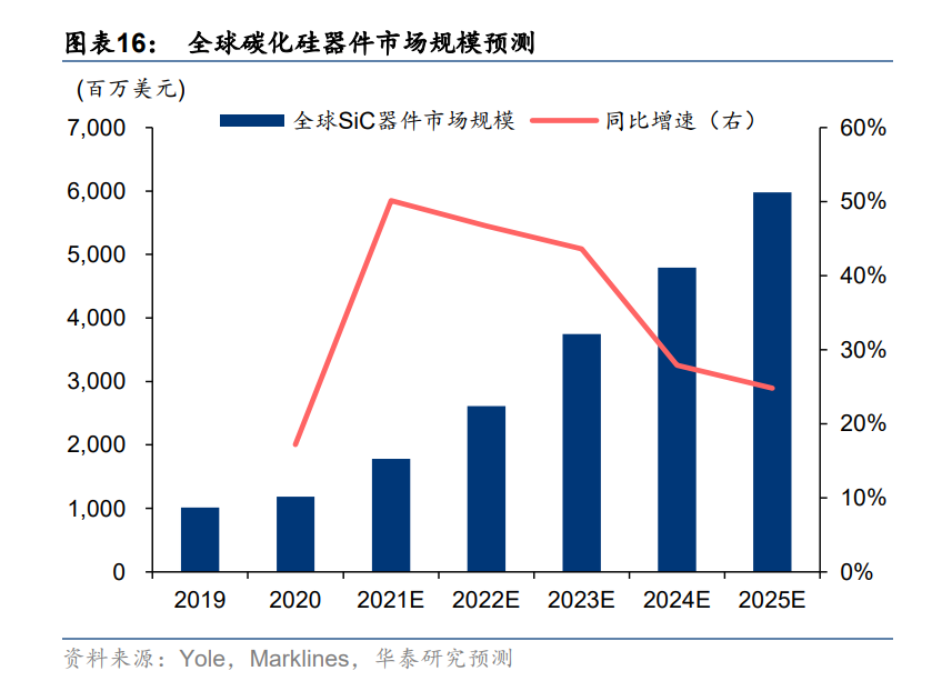 2020 年全球 SiC 器件市場(chǎng)規(guī)模達(dá) 11.84 億美元,預(yù)計(jì)到 2025 年有望增長至 59.79 億美元,對(duì)應(yīng)復(fù)合年均增長率為 38.2%。根據(jù)測(cè)算,在碳中和趨勢(shì)下,受益于 SiC 在新能源汽車、光 伏、風(fēng)電、工控等領(lǐng)域的持續(xù)滲透,SiC 功率器件市場(chǎng)規(guī)模有望從 2020 年的 2.92 億美元增長至 2025 年的 38.58 億美元,對(duì)應(yīng)復(fù)合年均增長率為 67.6%;以及在5G通信、下游SiC功率及射頻器件高速增長的需求也將帶動(dòng) SiC 材料市場(chǎng)規(guī)??焖俪砷L。