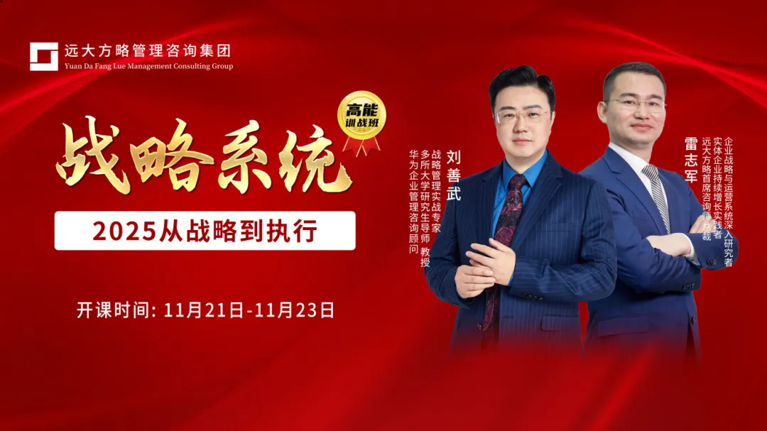 為幫助企業(yè)贏戰(zhàn)2025,10月24日-26日,遠大方略特邀華為企業(yè)管理咨詢顧問劉善武老師,為大家?guī)砹藶槠谌斓摹?strong>戰(zhàn)略系統(tǒng)-2025從戰(zhàn)略到執(zhí)行》課程,重新理解和審視戰(zhàn)略,幫助更多企業(yè)保持方向大致正確,高效落地執(zhí)行,跑上極速增長快車道。