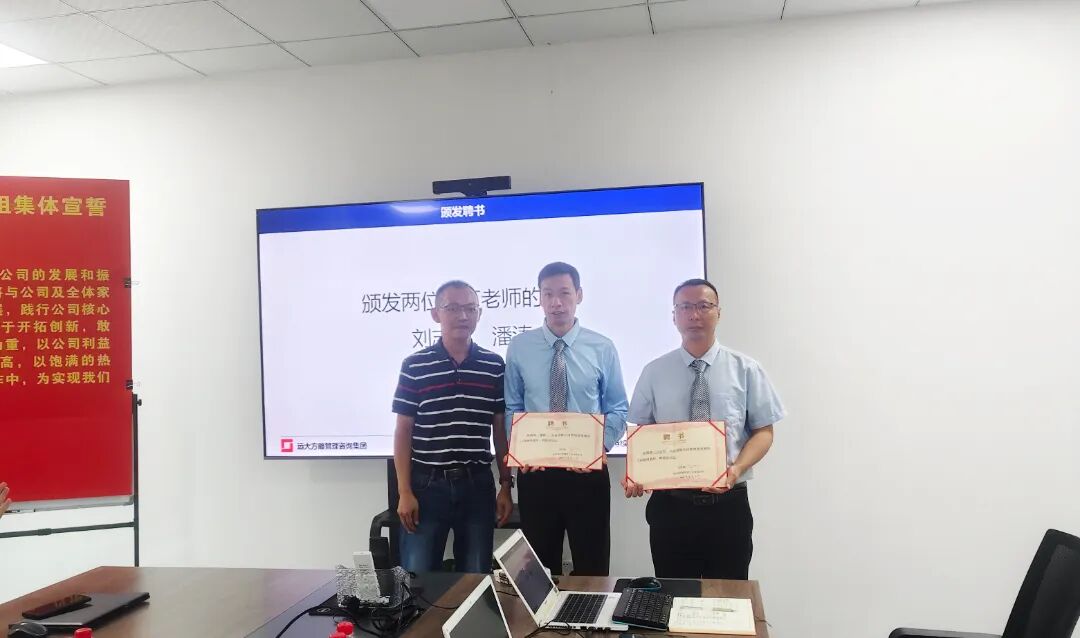 為促進(jìn)項(xiàng)目的有效落地,明確各崗位職責(zé),強(qiáng)化責(zé)任意識(shí),會(huì)上陳總為遠(yuǎn)大方略項(xiàng)目組頒發(fā)授權(quán)書(shū),為項(xiàng)目組老師頒發(fā)了聘書(shū)。