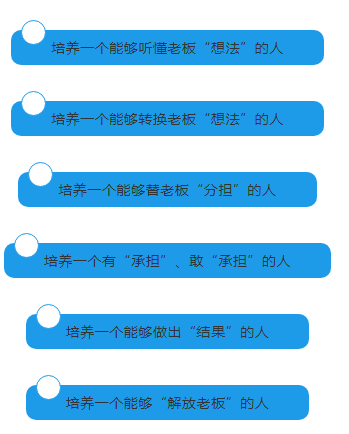 讓老板走出去,花更多的時間去研究市場、研究產(chǎn)品方向。讓操盤手具有自主經(jīng)營意識思維的人,不管老板在與不在公司,都能讓企業(yè)正常運營,推動處理跨部門的事情;為將來企業(yè)做大做好準備;使公司戰(zhàn)略可真正的落地執(zhí)行。通過訓練,提升操盤手解決問題的能力、系統(tǒng)思維能力與實戰(zhàn)運營能力。